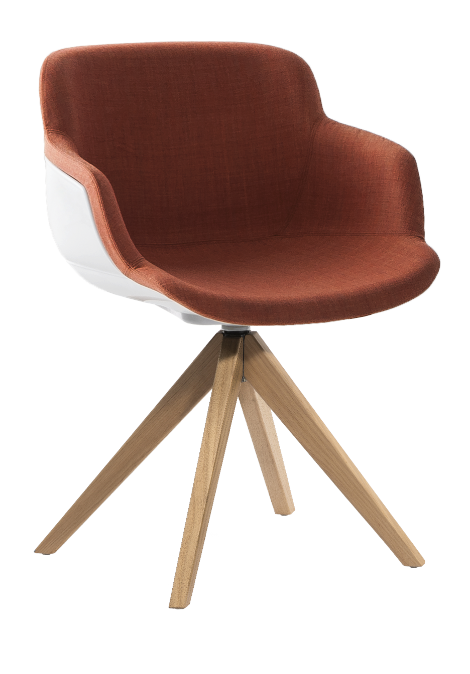 Techno-polymer upholstered chair, 4-legged wooden swivel base with solid Oak spokes reinforced with inner steel structure.