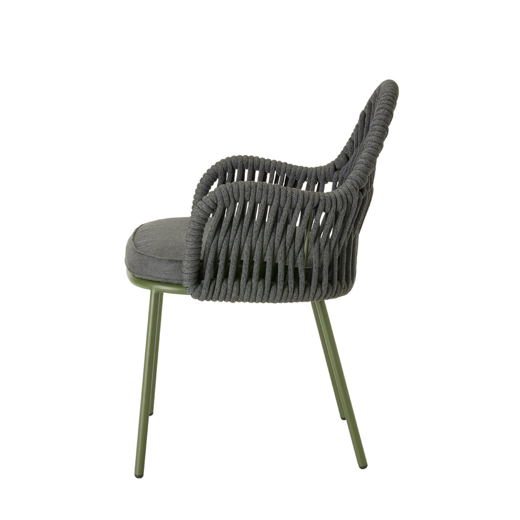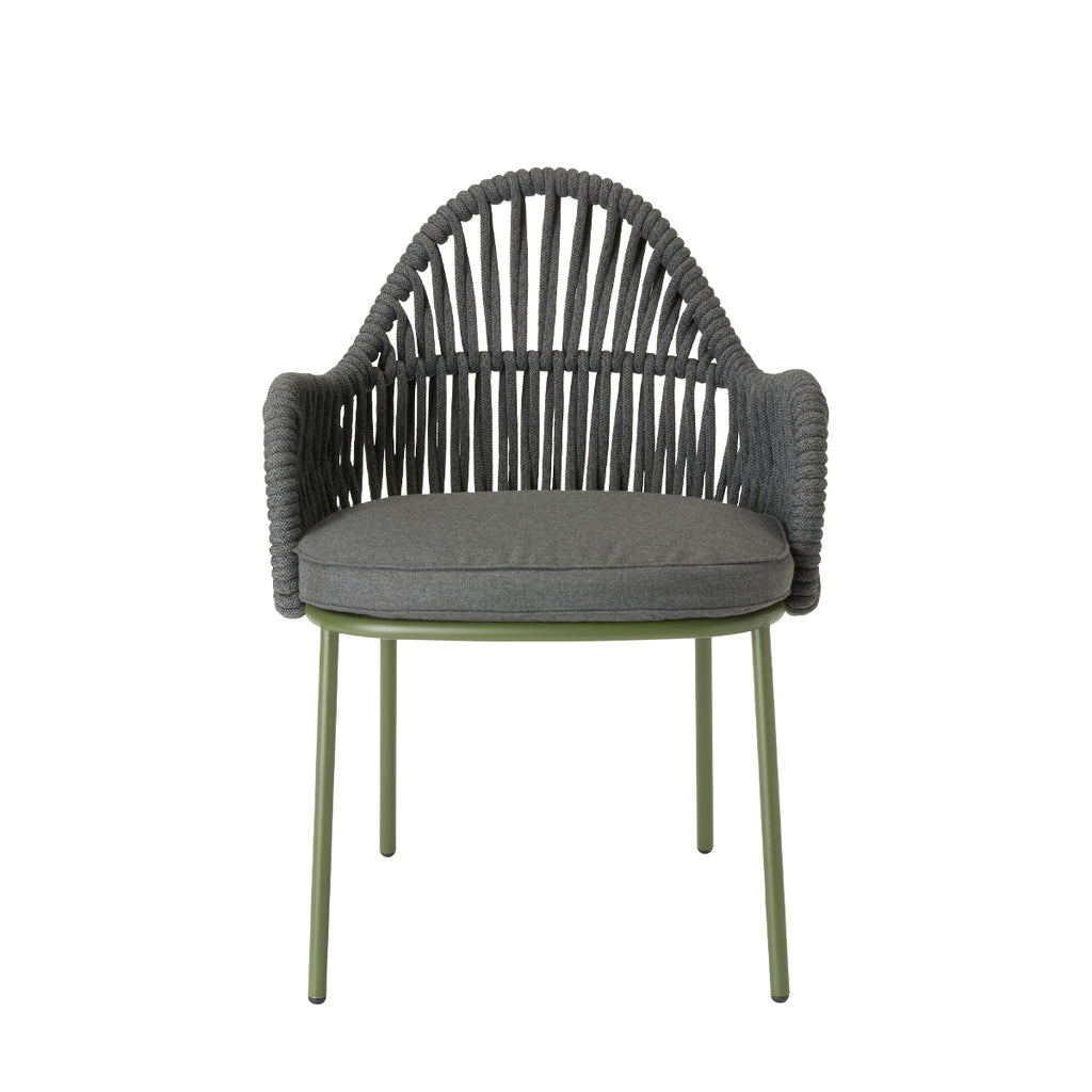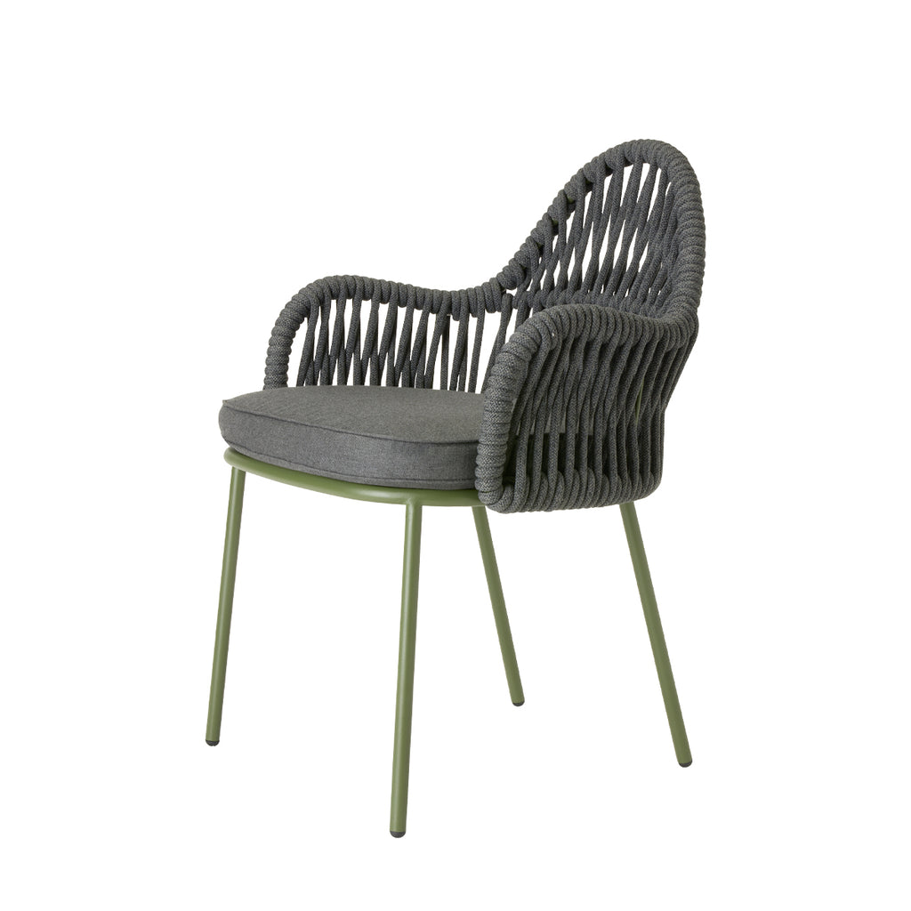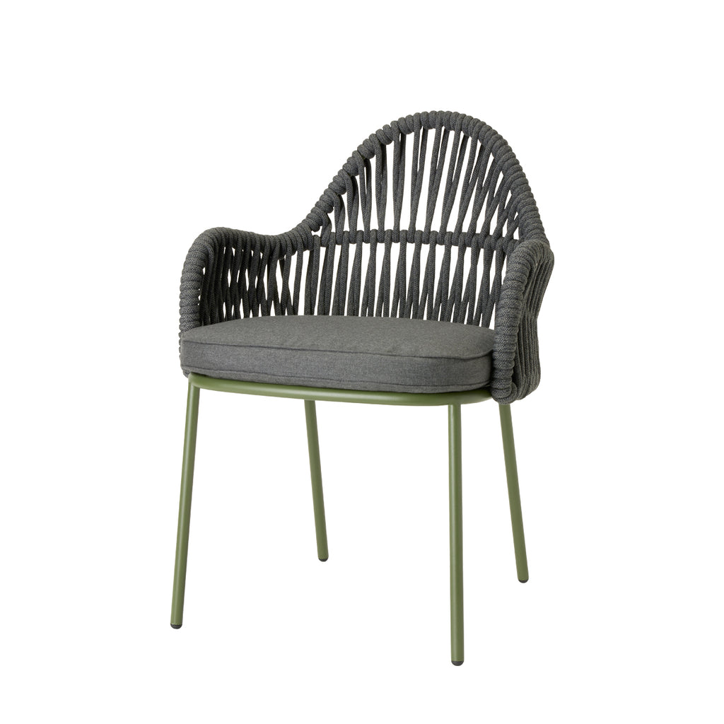 Malvasia Riviera is an outdoor accent chair that captures the essence of leisurely elegance. Distinguished by its woven rope backrest, this design offers a refined departure from traditional metal frameworks, introducing warmth and organic appeal to any exterior setting. Generously proportioned armrests and a cushioned seat deliver immediate comfort, while the carefully executed rope weave creates an aesthetic that evokes the gentle sensation of a cooling breeze. The sophisticated use of tonal rope variations enables seamless coordination with diverse color palettes, making this piece a versatile addition to contemporary outdoor spaces.